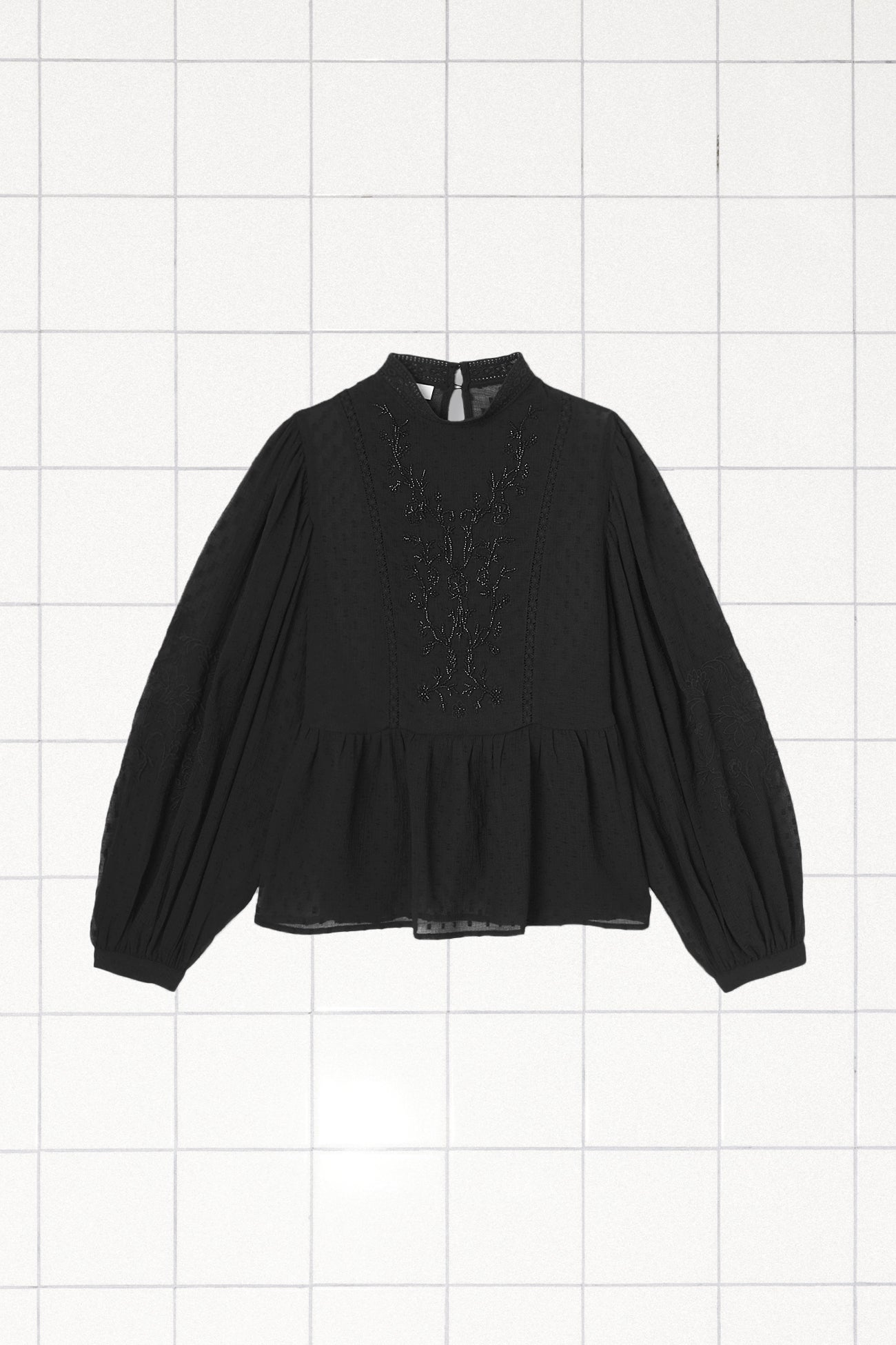 Styl wiktoriański i neoromantyzm w powietrzu! Bluzka z woalowej tkaniny ma haftowane rękawy z bufiastymi rękawami i haftowane perełki na plisie. Lekko rozkloszowany krój. Koronkowa stójka, ażurowe zdobienia po obu stronach dekoltu, wycięcie w kształcie kropli na karku. Długie rękawy, mankiety zapinane na guziki. Zaokrąglony dół. Ta bluzka damska zawiera włókna pochodzące z recyklingu.