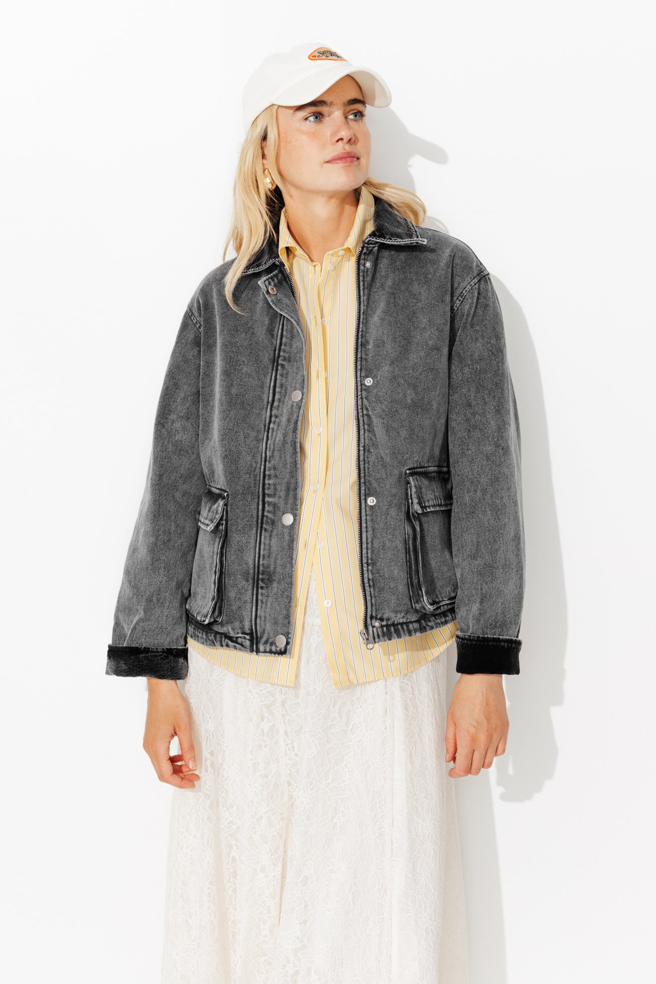 Androgyniczny charakter i styl workwear. Ta jeansowa kurtka jest nową gwiazdą sezonu dzięki kołnierzykowi z klapami i mankietom z sztruksu. Świetnie wygląda w połączeniu z sukienką lub spódnicą, pozwalając na mieszanie stylów. 100% bawełna jeansowa. Prosty krój. Ukryty zamek pod patką zapinaną na zatrzask. 2 naszywane kieszenie z klapką. Długie rękawy, regulowane mankiety. Prosty dół. Przeszycia.