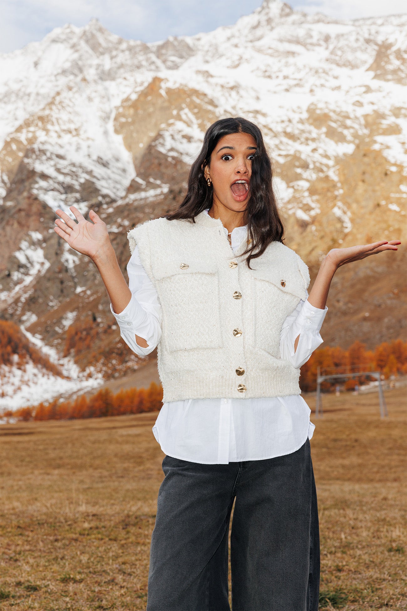 Ten bezrękawnik z złotymi guzikami, zachwyca grubą, fantazyjną dzianiną, dyskretnie rozjaśnioną miniaturowymi złotymi cekinami. Krój prosty. Okrągły dekolt. Zapięcie na guziki. 2 duże kieszenie na piersi. Prosty dół. Ściągacze.