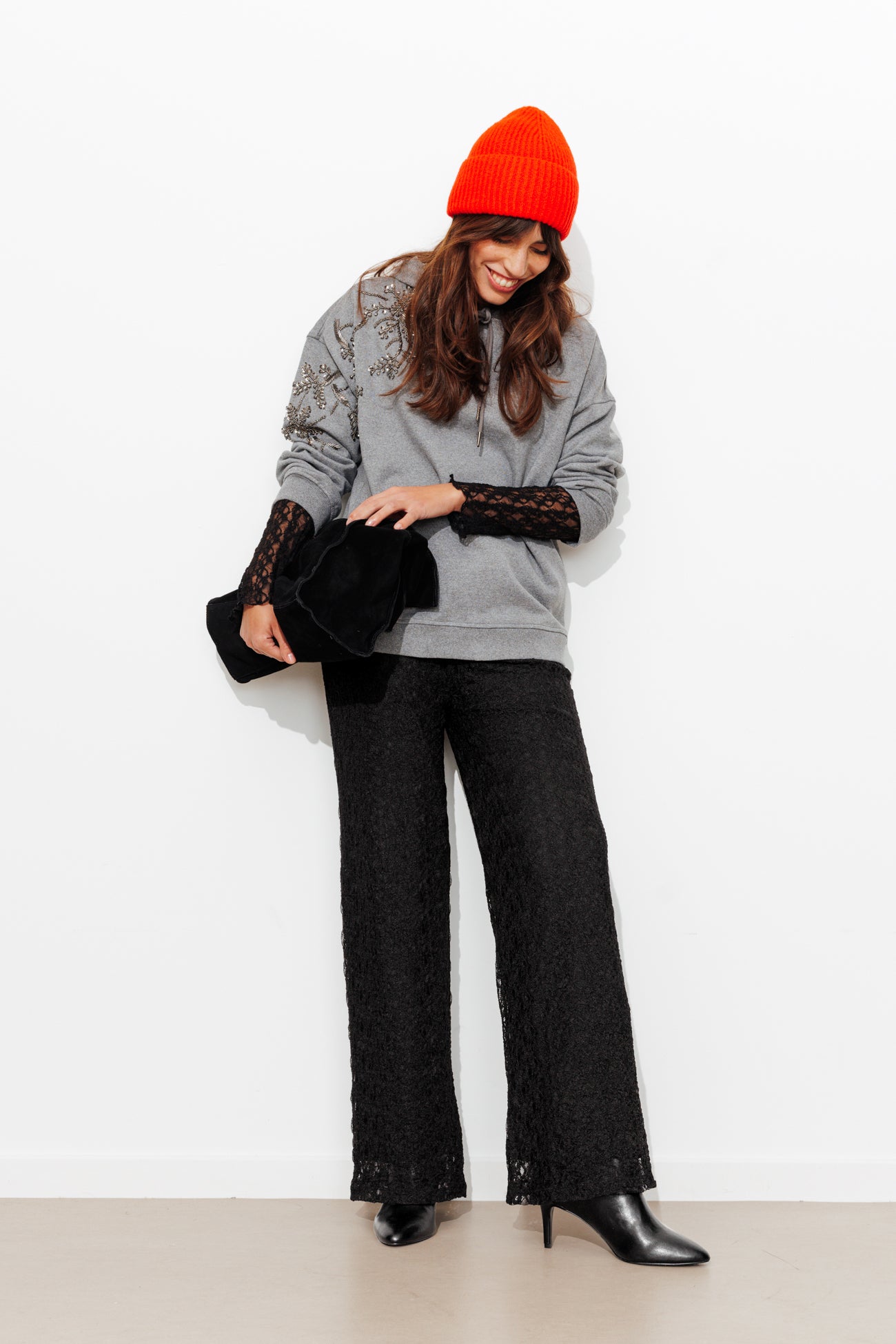 W tym sezonie stawiamy na koronkę! Jest ona obecna wszędzie i swobodnie wyraża się na tych spodniach z wysokim stanem. Wydłuż sylwetkę, zakładając je do szpilek. Nadaj im swobodny charakter, łącząc je z bluzą. Prosty krój, długie nogawki. Całkowicie elastyczny pas. Przeszyte nogawki. Te spodnie damskie zawierają włókna pochodzące z recyklingu.