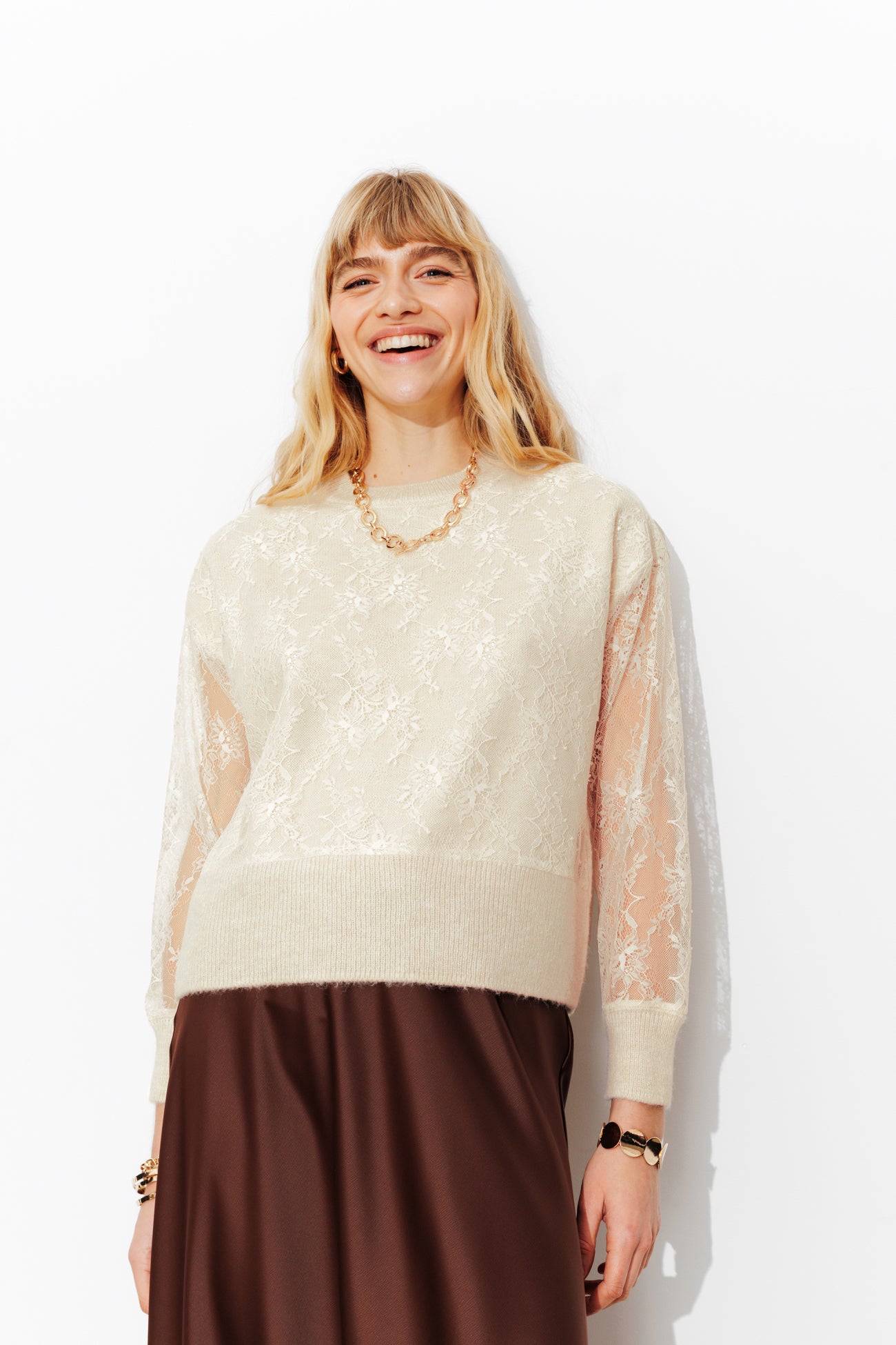Dzianina i koronka. Warstwy i prześwity: idealnie wpisują się w aktualne trendy! Dzianina wzbogacona wełną zapewnia większe ciepło. Lekko zwężany dół. Okrągły dekolt ze ściągaczem. Lekko obniżona linia ramion. Koronkowe rękawy, ściągacze przy nadgarstkach. Ściągacz u dołu. Tył z dzianiny. Ten damski sweter zawiera włókna pochodzące z recyklingu.