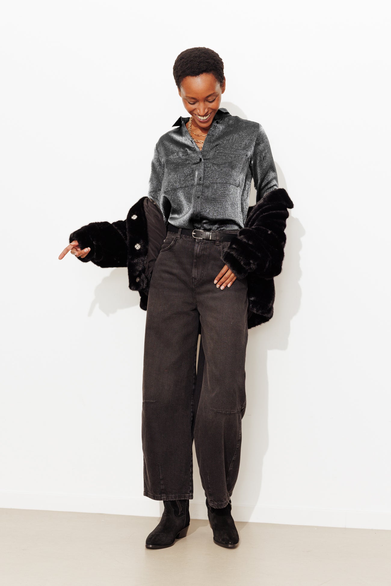 Prosty, długi krój. Kołnierzyk koszulowy. Zapięcie na guziki na całej długości. 2 kieszenie na piersi. Długie rękawy, mankiety zapinane na guziki. Zaokrąglony dół. Szwy w tym samym kolorze. Ta koszula damska zawiera wiskozę pochodzącą z pulpy drzewnej z lasów zarządzanych w sposób zrównoważony.