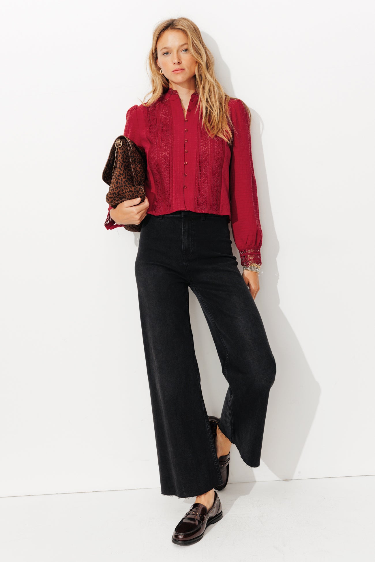Wiemy, że Wam się podoba… więc przywołujemy retro kody! Tutaj koronka i szydełkowe detale zdobią gniecioną bawełnę. Krój prosty i krótki. Wysoki, okrągły kołnierz. Zapięcie na guziki z przodu. Marszczenia na górze długich rękawów. Mankiety na guziki. Zawiera bawełnę organiczną, uprawianą bez pestycydów, nawozów chemicznych i GMO, aby chronić bioróżnorodność.