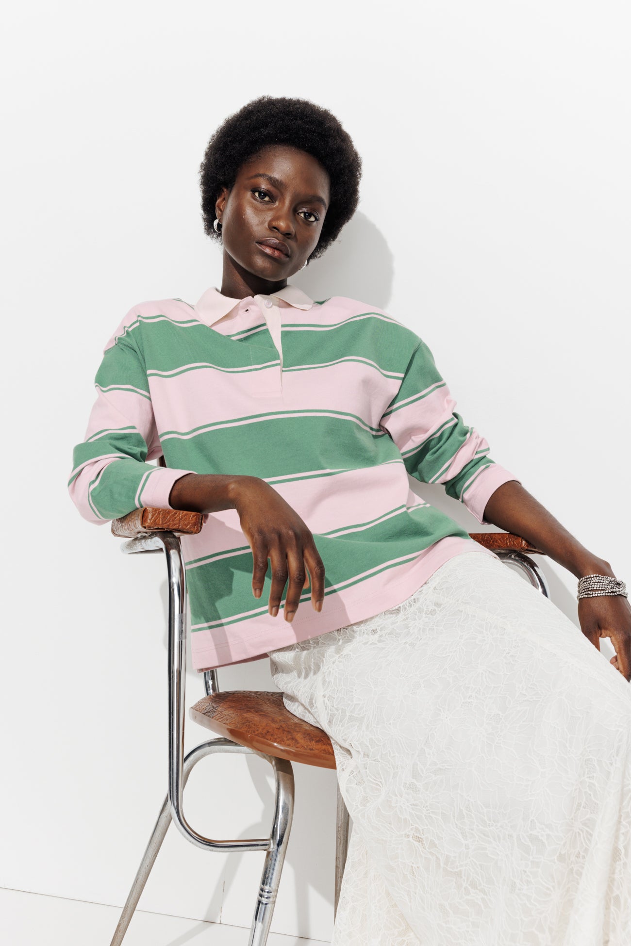 Styl młodzieżowy i chłopięcy wkracza do naszej garderoby: to świetny sposób na zabawę połączeniem stylu męskiego i kobiecego ! Miękka i gruba dzianina dżersejowa, przyjemna w noszeniu. Oversize'owy krój. Kołnierzyk polo z prążkowanym wykończeniem, zapięcie na guziki ukryte pod plisą. Lekko obniżone rękawy. Długie rękawy. Prosty dół. Ta koszulka damska zawiera włókna pochodzące z recyklingu.
