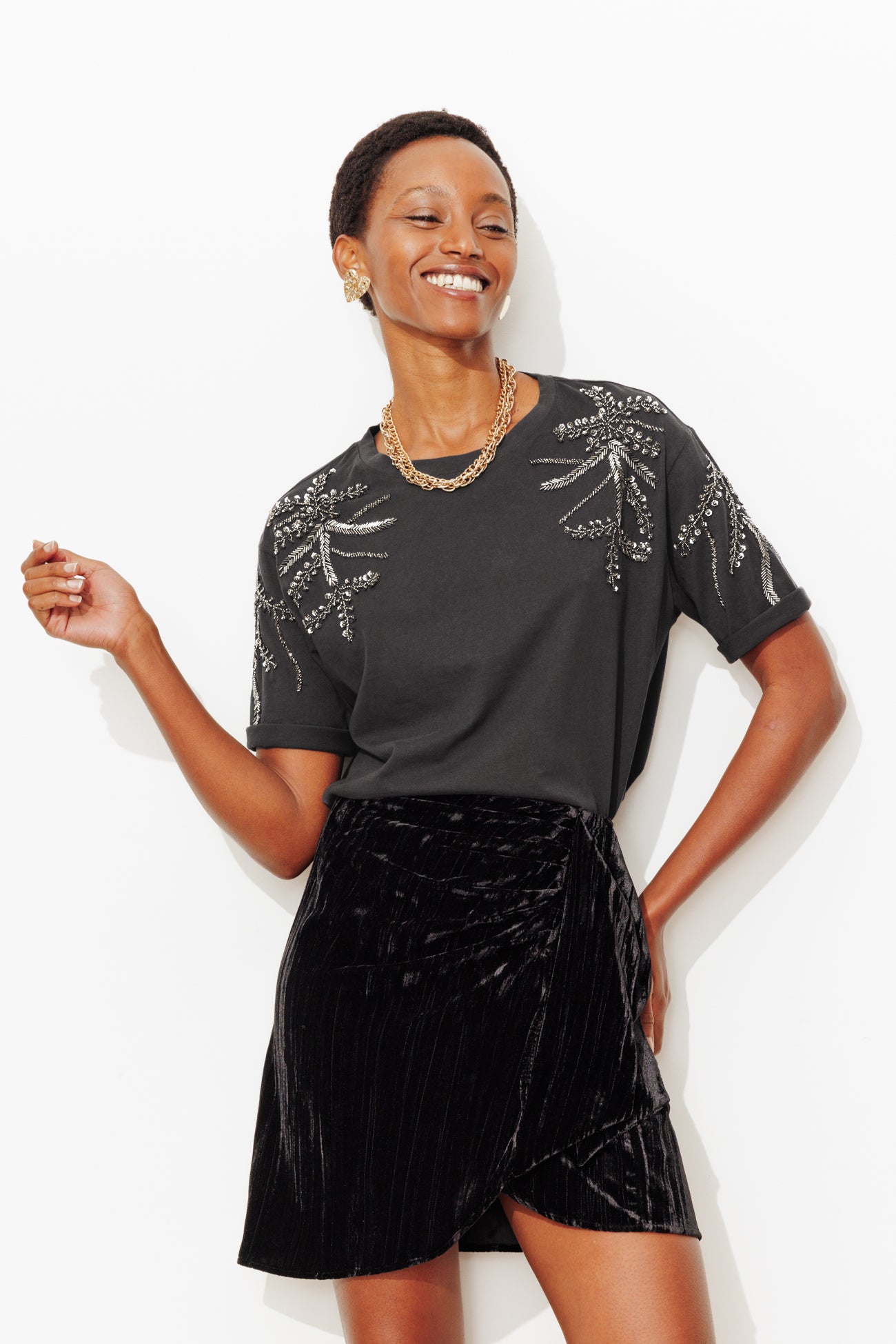 Miękka dzianina dżersejowa. Prosty krój. Okrągły dekolt. Krótkie rękawy. Prosty dół. Szwy w tym samym kolorze. Ta koszulka zawiera bawełnę pochodzącą z ekologicznych upraw, uprawianą bez pestycydów, nawozów chemicznych i GMO, aby zachować różnorodność biologiczną.