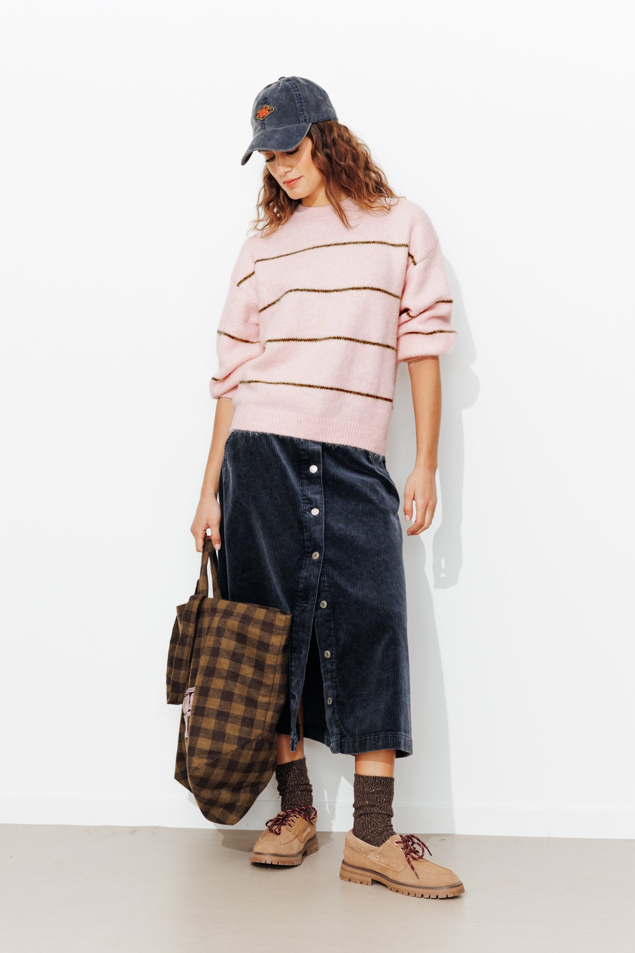 Cienkie paski i miękka dzianina – to połączenie tworzy sweter, w którym zakochasz się od razu! Dostępny w wielu kolorach, z przyjemnością ogrzeje każdy look. Żakardowe paski, lekko zwężany krój, okrągły prążkowany dekolt, obniżone ramiona, długie rękawy, prążkowane mankiety i prosty dół. Zawiera włókna z recyklingu.