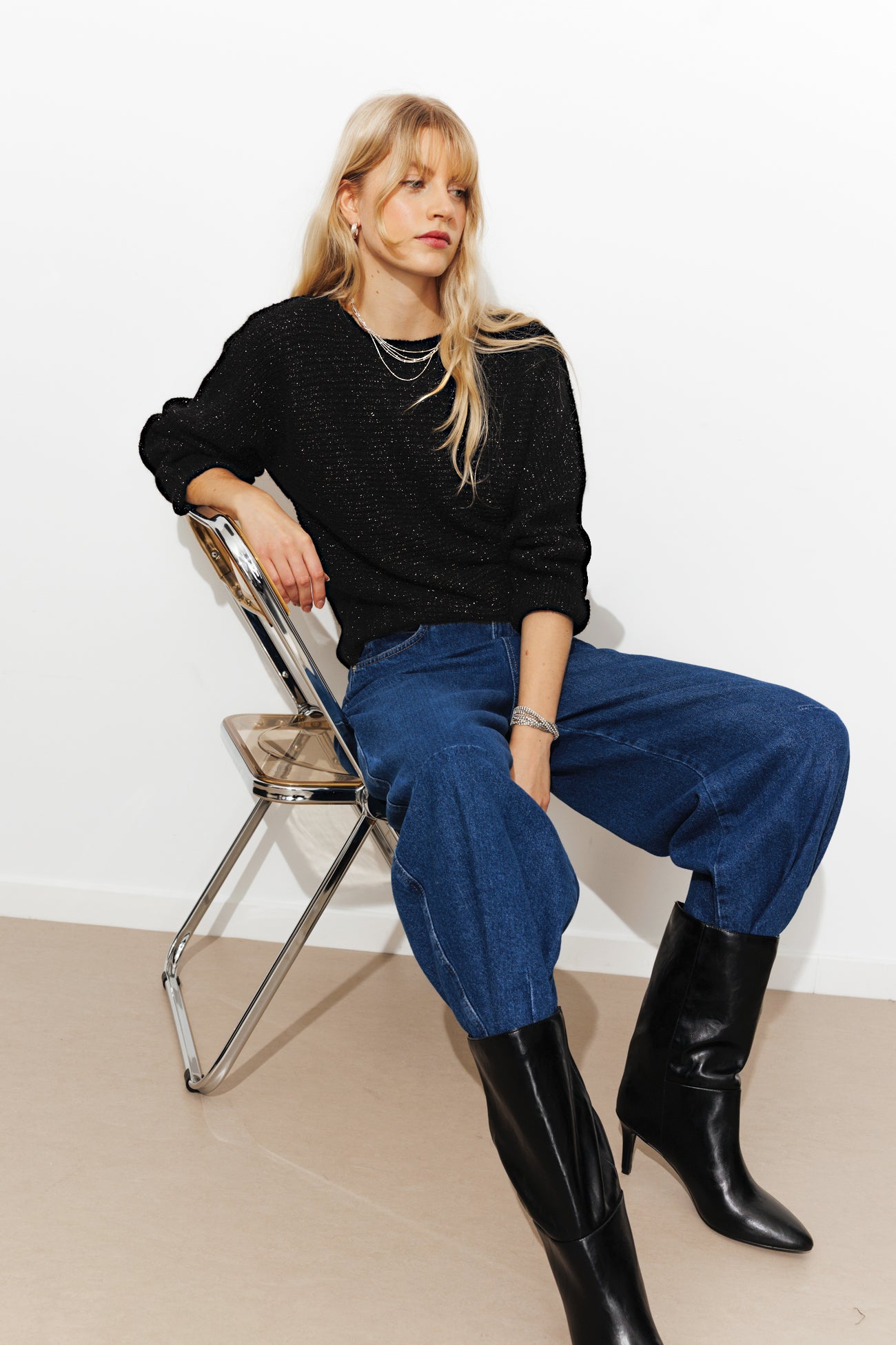 Nie sposób oprzeć się pokusie, by otulić się tym oversize'owym swetrem! W tym sezonie uwielbiamy go w połączeniu z satyną, aksamitem lub jeansem. Poziome prążki wzbogacone są metalicznymi nitkami. Okrągły dekolt ze ściągaczem. Długie rękawy. Prosty dół. Ściągacze.