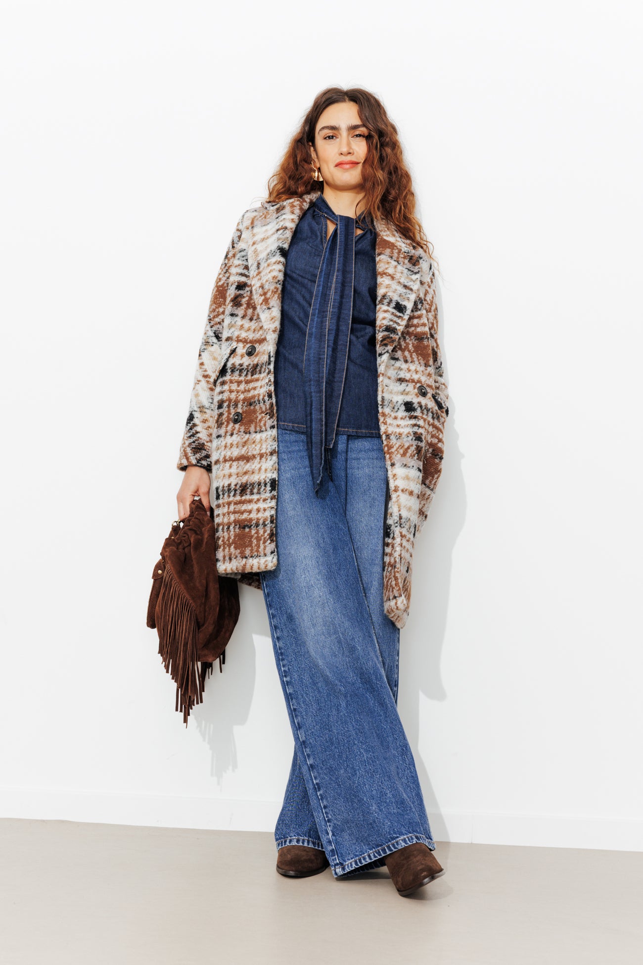 Modowy hit! Wełna o fakturze boucle, rozmazana kratka i ciepło przez cały dzień – ten prosty płaszcz nadaje stylowi brytyjski szyk lat 70. Prosty krój, dwurzędowe zapięcie, dwie kieszenie z klapką, długie rękawy, prosty dół, satynowa podszewka. Płaszcz zawiera wełnę z recyklingu.