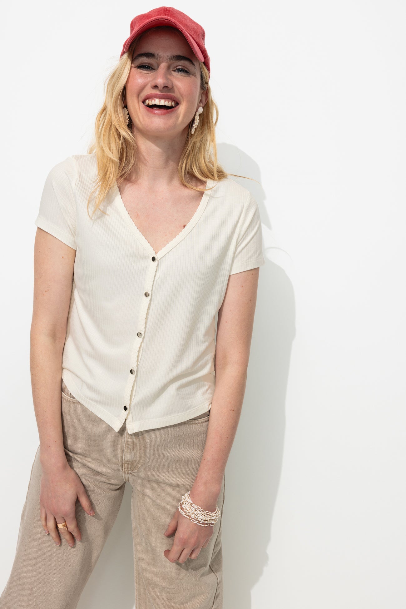 Koszulka z prążkowanego jerseyu łączy styl retro ze sportowym! Miękki, elastyczny jersey. Prosty krój. Dekolt w kształcie litery V. Zapięcie na guziki (metalowe guziki w srebrnym kolorze). Krótkie rękawy. Prosty dół. Ta damska koszulka zawiera wiskozę wykonaną z pulpy drzewnej pochodzącej z lasów zarządzanych.