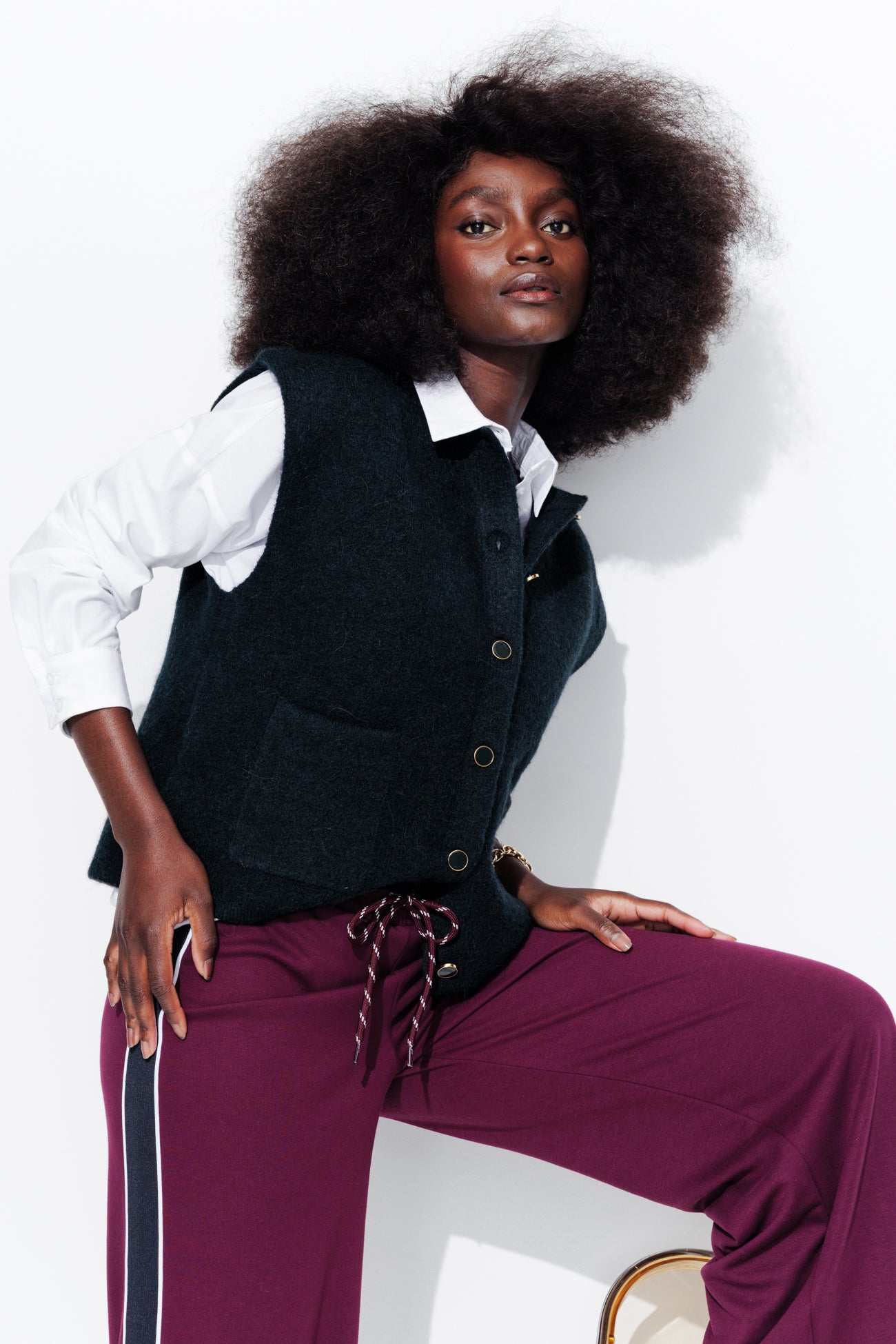Jest krótki, prosty i bez rękawów. Elegancki element garderoby, który można połączyć z męską koszulą, T-shirtem... Podoba nam się szykowne wykończenie emaliowanych guzików i dwie naszywane kieszenie z przodu. Warto zwrócić uwagę na miękkość i ciepło zwartej, elastycznej dzianiny wzbogaconej o wełnę alpaki. Okrągły dekolt. Prosty dół.