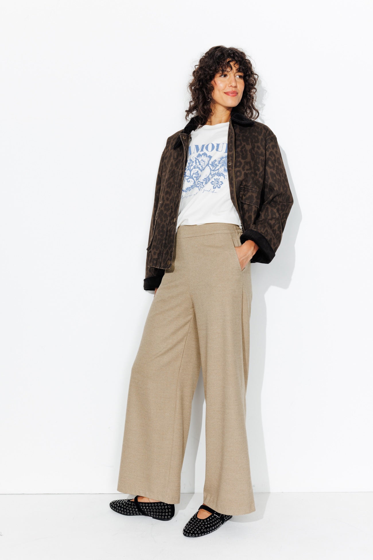 NIEZBĘDNE. Te spodnie z szerokimi nogawkami oscylują między miejskim szykiem a sportowym luzem. Wszystko zależy od momentu, który wybierzesz i butów, które do nich założysz: szpilek, balerinek, trampek lub loafersów. Miękka tkanina, pięknie opadająca na nogę. Wyprofilowany pas z przodu i elastyczny tył dla większego komfortu. Wysoki stan. Te damskie spodnie zawierają włókna z recyklingu.