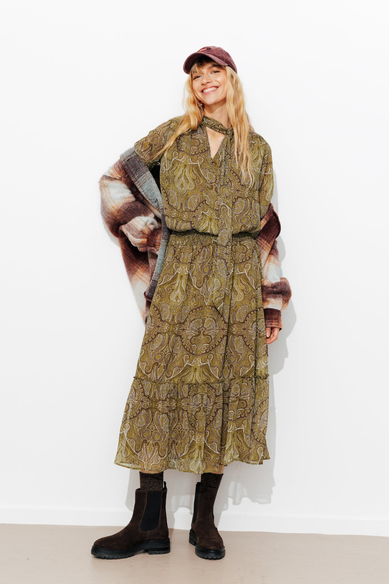Lekko opalizująca tkanina. Falbanki. Wzór w stylu boho. Od razu wiadomo, że w tej długiej sukience będziemy wyglądać olśniewająco. Wiązany kołnierzyk typu lavallière, prawdziwa elegancka klasyka, podkreśla retro styl modelu. Marszczenia na ramionach. Długie rękawy, elastyczne mankiety. Elastyczny, marszczony pas. Wykończenie z falbanką. Ta sukienka damska zawiera włókna pochodzące z recyklingu.