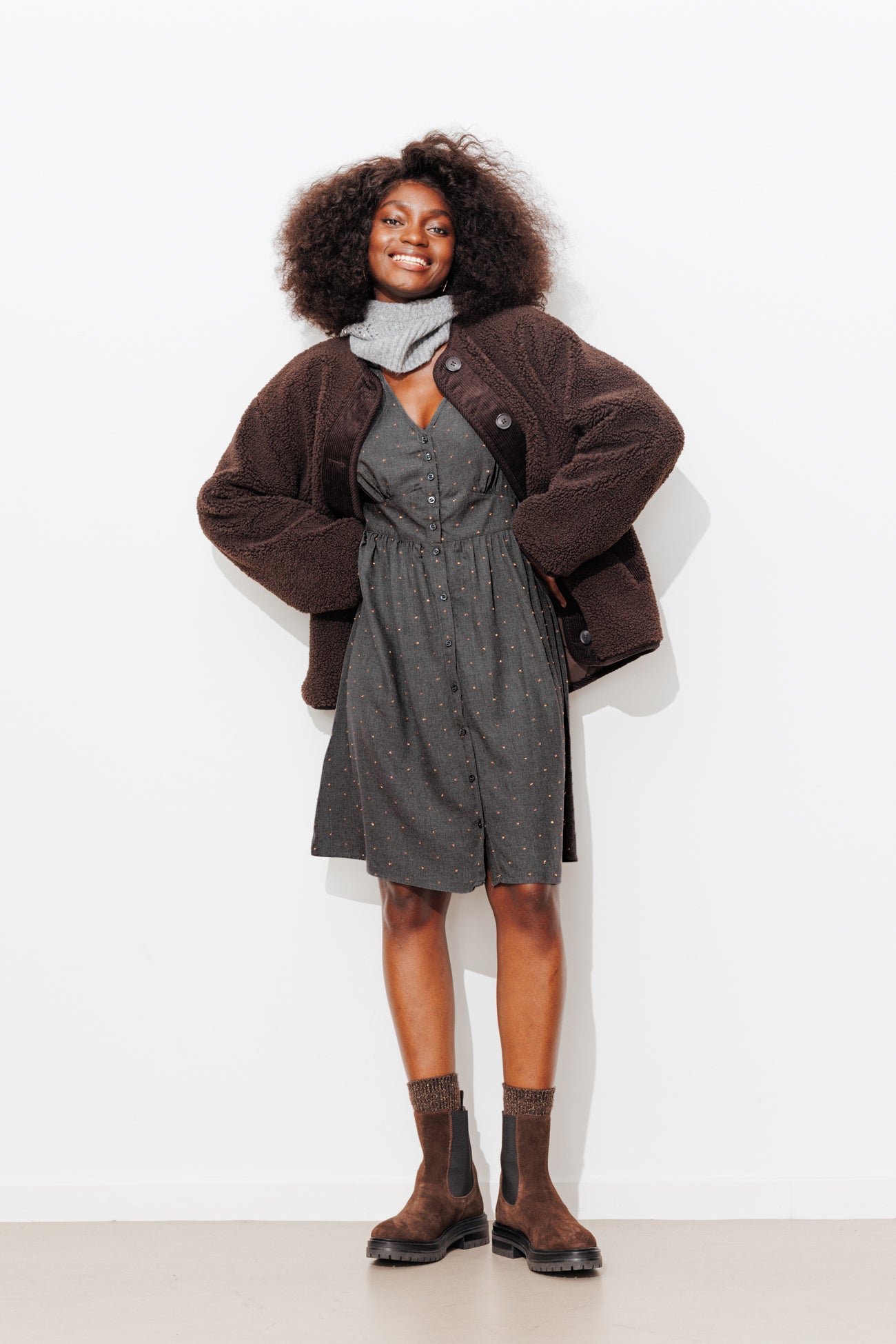 Niezwykle wygodna, nadaje się zarówno na dzień, jak i na wieczór. Dodatki, buty i biżuteria zrobią swoje: całkowicie odmienią stylizację! Luźny krój poniżej pasa, zaznaczony z przodu i marszczony z tyłu. Dekolt w kształcie litery V. Zapięcie na guziki. Długie rękawy, elastyczne mankiety. 100% wiskoza pochodząca z pulpy drzewnej z lasów zarządzanych w sposób zrównoważony.