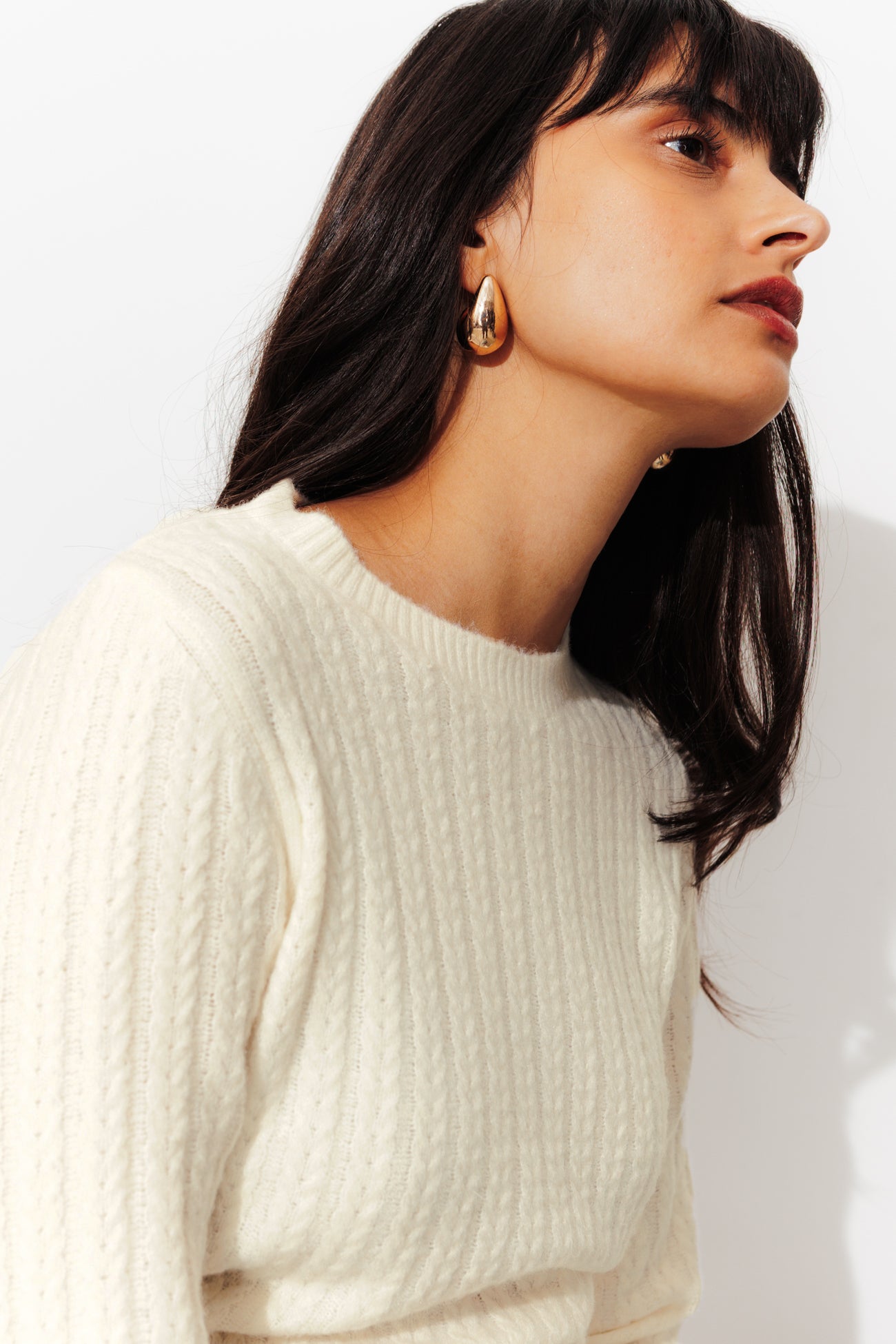 W tym sezonie wszędzie królują warkocze! W tym swetrze są drobne, co podkreśla styl preppy. Do mini spódnicy będzie szykowny, do jeansów – w klimacie brytyjskiego cool. Miękka dzianina z wełną, krój dopasowany, okrągły dekolt, długie rękawy z ściągaczami, dół prosty. Sweter zawiera włókna z recyklingu.