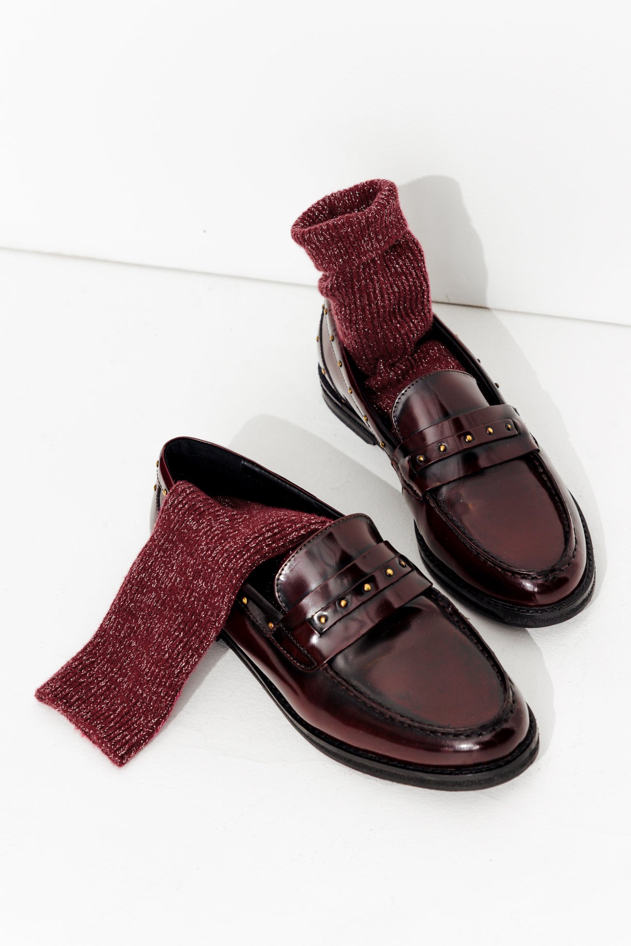Aby nadać naszej jesienno-zimowej stylizacji świąteczny charakter, możemy postawić na błyszczący efekt tych skarpet z elastycznej dzianiny prążkowanej, wzbogaconej metalicznymi nitkami. W tym roku nosimy je do mokasynów, botków lub półbutów typu derby. Wyraźna pięta i czubek. Elastyczny prążkowany brzeg. Świetny pomysł na prezent.