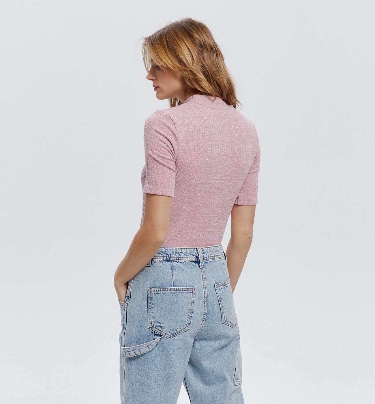 Ten wyjątkowy t-shirt w prążki to must-have sezonu: jest miękki, elastyczny i łatwy do dopasowania. Możemy go sobie wyobrazić z jeansami cargo, spodniami chino z paskiem lub płóciennymi spodenkami. Można go również nosić pod kurtką lub bluzką. Ściśle dopasowany krój. Wysoki kołnierz. Krótkie rękawy. Prosty dół.