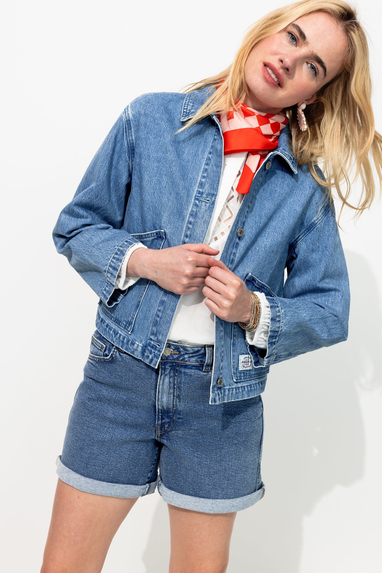 Pewniak! Białe jeansowe spodenki zwiastują radosne, słoneczne lato: nie możesz się bez nich obejść! Pasują do wszystkich topów sezonu! Można je nosić z butami sportowymi, chodakami lub sandałami. Biały denim, elastyczny i lekko rozciągliwy. Szlufki na pasek. Zapięcie na guzik i metalowy zamek z przodu. 5 kieszeni. Te damskie szorty są wykonane z bawełny pochodzącej z recyklingu.