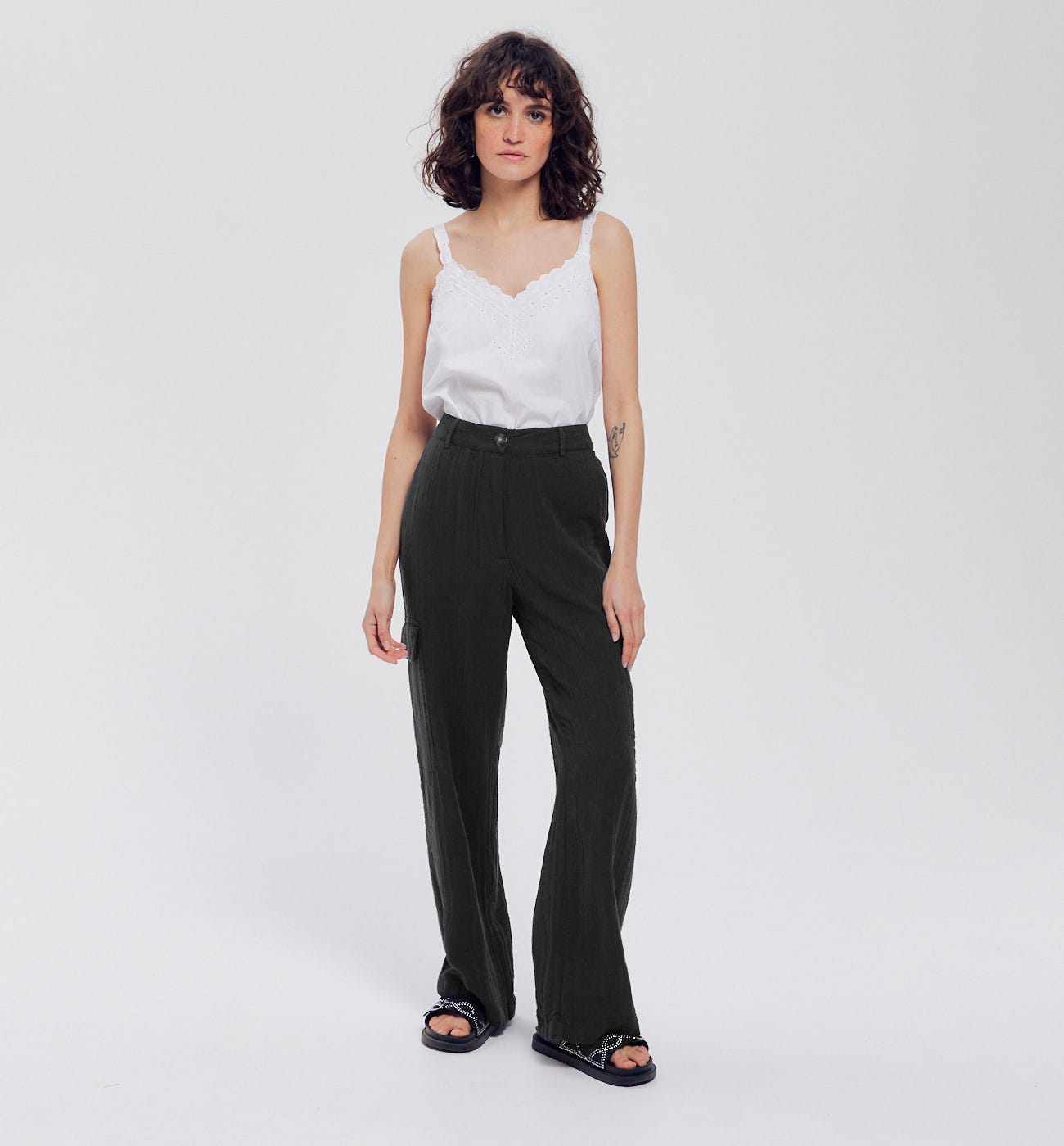 Ten swobodny model jest wycięty z podwójnego bawełnianego muślinu, miękkiej, przewiewnej tkaniny o lekko waflowym wzorze. Szerokie nogawki. Szlufki. Zapięcie na guzik i zamek z przodu. 4 kieszenie.
