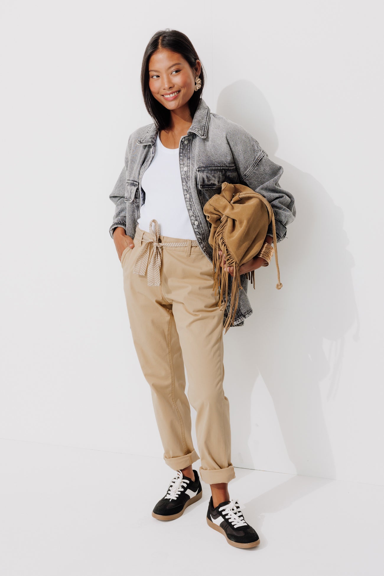 Bawełniane chinosy to świetny element każdej wiosenno-letniej garderoby lub wakacyjnej walizki! Możesz założyć je wszędzie i dowolnie zmieniać ich styl. Szlufki na pasek. Odpinany tkany pasek. Zapięcie z przodu na guzik i zamek. 2 kieszenie. Zawiera włókna z recyklingu. Wykonane z zebranych tekstyliów lub tworzyw sztucznych, włókna z recyklingu są przekształcane w nową odzież.