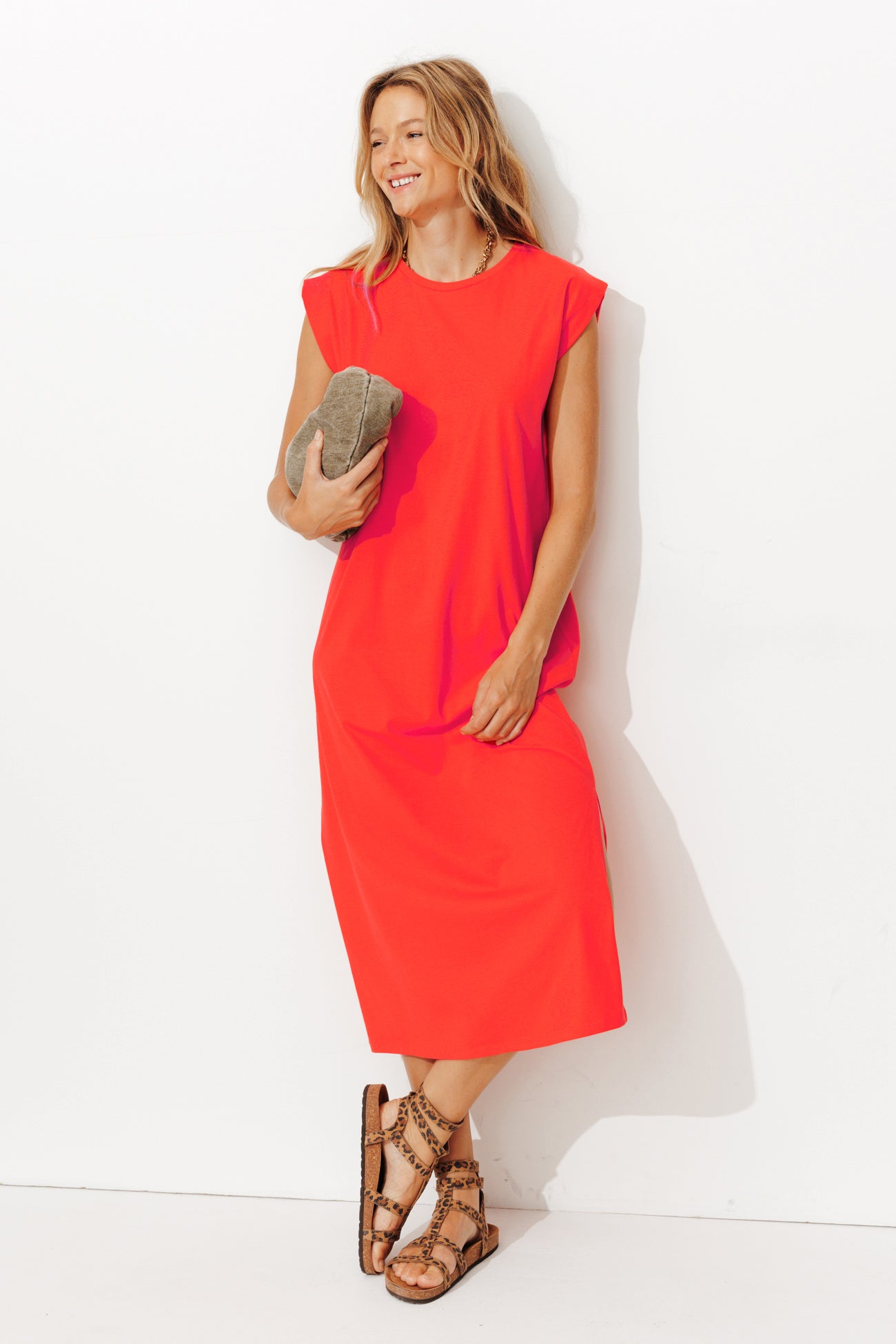 Bardzo krótkie rękawy i rozcięcia po bokach. Ta średniej długości sukienka z miękkiego jerseyu to regularny hit! Akcesoria są mile widzianym dodatkiem do stylu. Prosty krój. Zaokrąglony dekolt. Prosty dół. Wykonana z ekologicznej bawełny. Miękka i chłonna, ta naturalna tkanina jest uprawiana bez pestycydów, nawozów chemicznych lub GMO w celu zachowania bioróżnorodności.