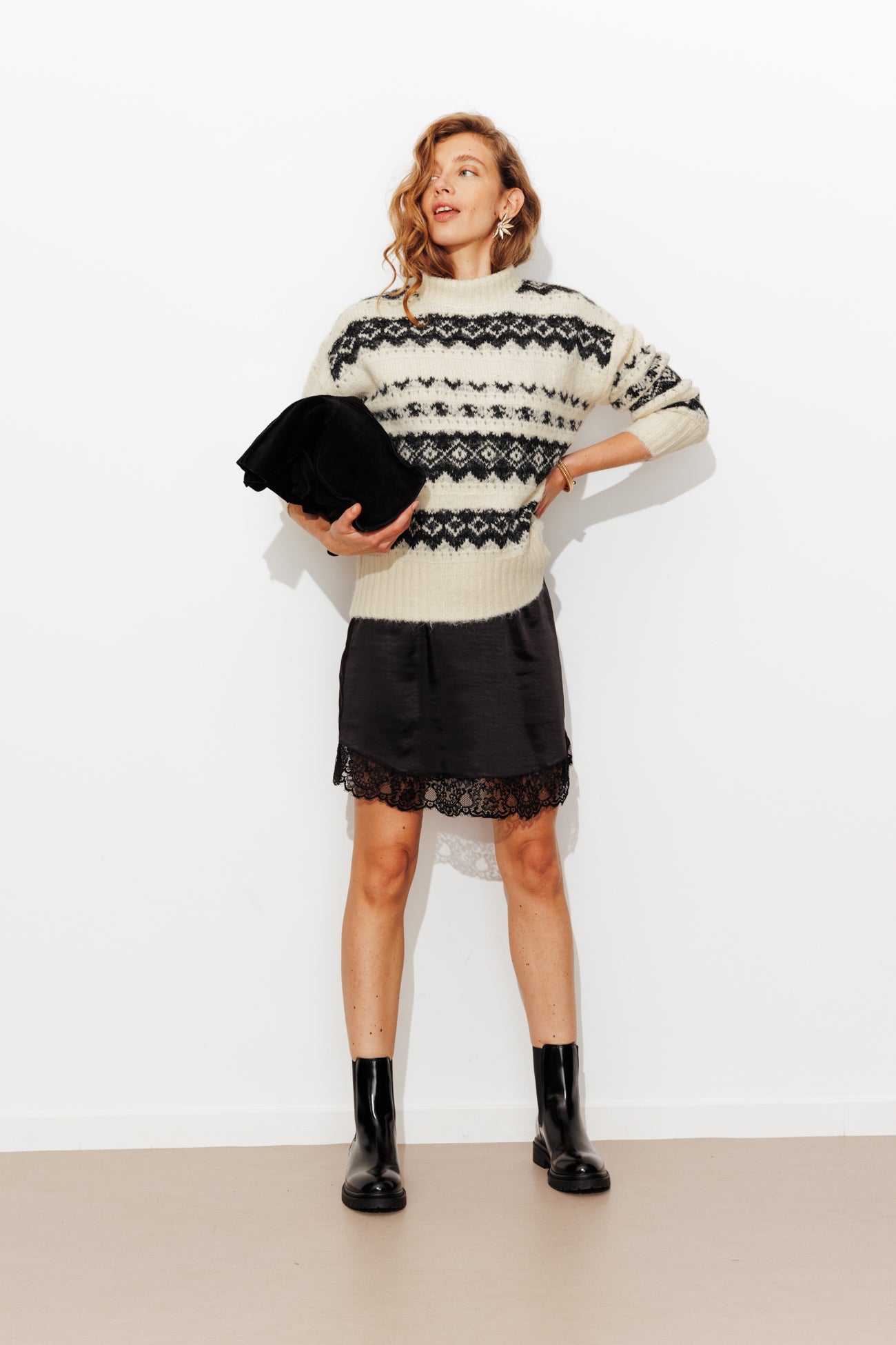 Ten sweter sprawia, że chce się wyruszyć w podróż. Na daleką północ Skandynawii, pod zorzę polarną, do miasta lub w góry. Miękka i puszysta dzianina wzbogacona wełną dla większego ciepła. Wzory żakardowe. Długi krój, lekko zwężany u dołu. Stójka z prążkowanej dzianiny. Długie rękawy. Prosty dół. Ściągacze. Ten damski sweter zawiera włókna pochodzące z recyklingu.