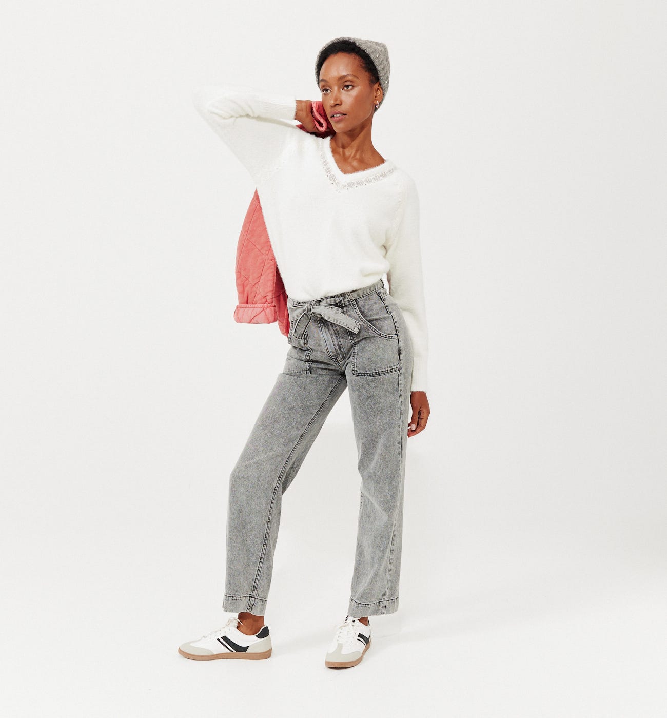Dzianina jest delikatna, super miękka i bardzo przytulna. Ponadto koronkowe warkocze na dekolcie w kształcie litery V i otworach na ręce nadają temu zwykłemu swetrowi charakteru. To idealny wybór do garderoby na nadchodzącą jesień i zimę. Puszysta dzianina. Lekko zwężany dół. Długie rękawy. Prosty dół. Prążkowany dół. Dostępny w różnych kolorach.